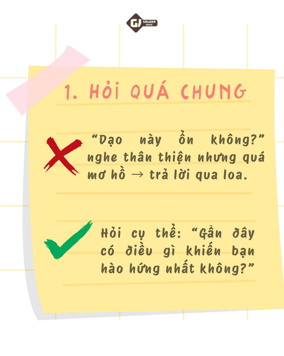 Những câu như “Dạo này ổn không?”, “Công việc thế nào?”, “Có gì mới không?” nghe có vẻ thân thiện – nhưng lại quá chung để khai thác được điều gì cụ thể.