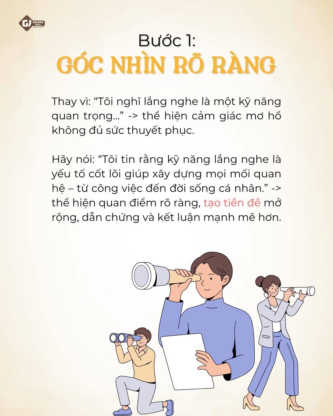 Một đoạn nói tốt không bắt đầu bằng “Tôi nghĩ là…” hay “Hình như…”. Những cụm từ này chỉ thể hiện cảm giác mơ hồ – không đủ sức thuyết phục người nghe. Góc nhìn rõ ràng là câu khẳng định điều bạn tin là đúng, là quan điểm bạn muốn người khác nhớ và cân nhắc.