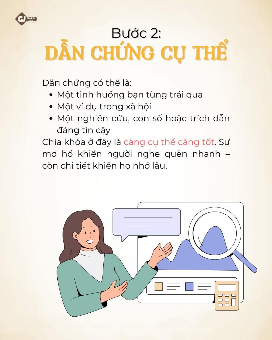 Chìa khóa ở đây là càng cụ thể càng tốt. Sự mơ hồ khiến người nghe quên nhanh – còn chi tiết khiến họ nhớ lâu.