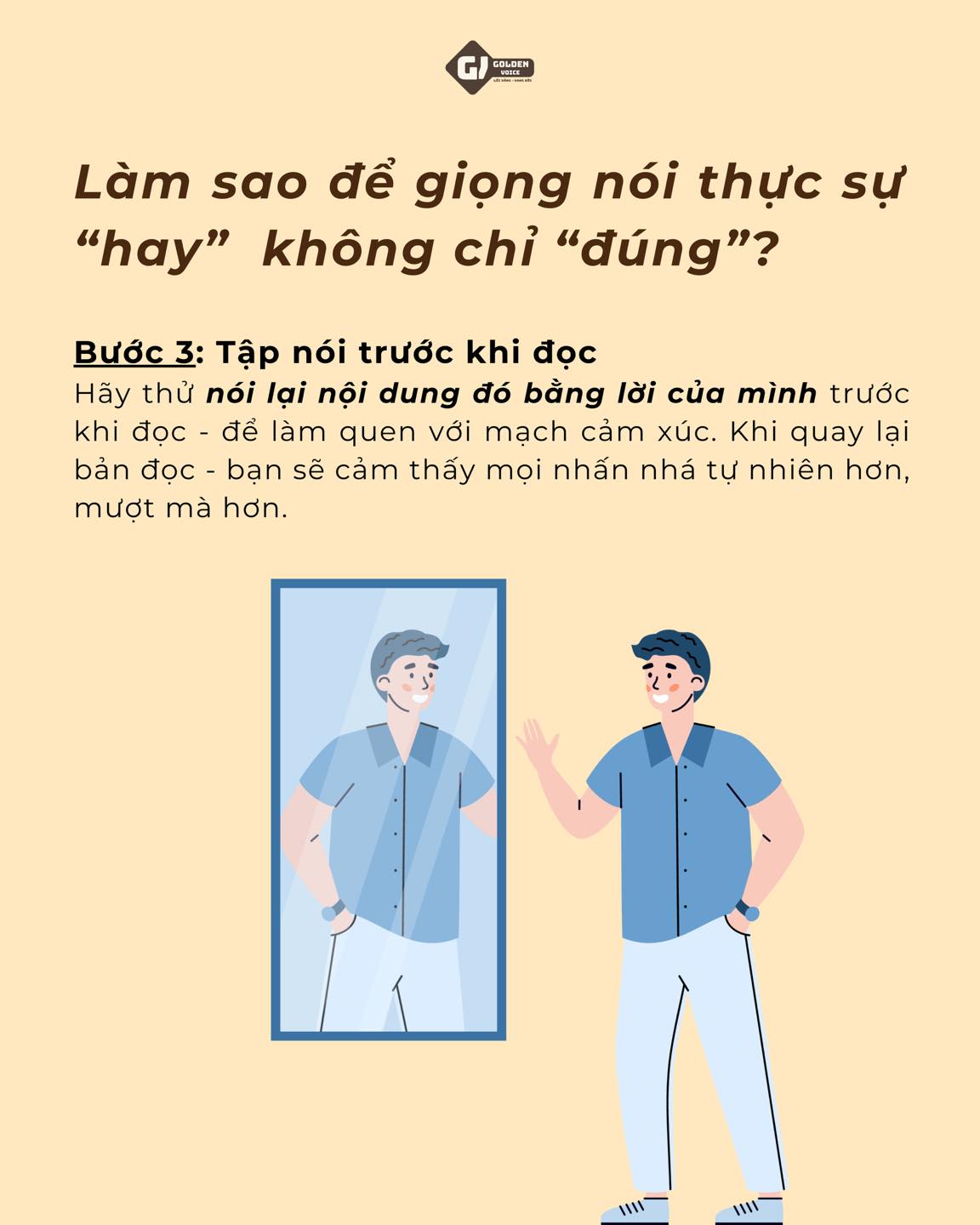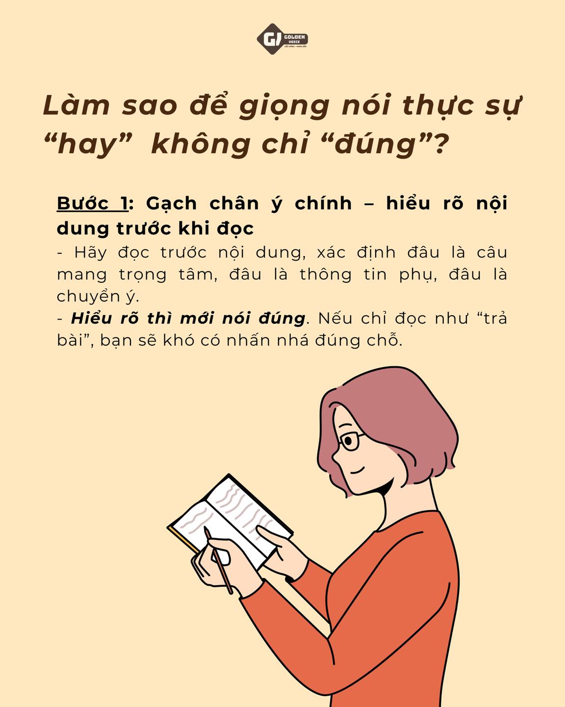 Hãy thử nói lại nội dung đó bằng lời của mình trước khi đọc – để làm quen với mạch cảm xúc. Khi quay lại bản đọc – bạn sẽ cảm thấy mọi nhấn nhá tự nhiên hơn, mượt mà hơn.