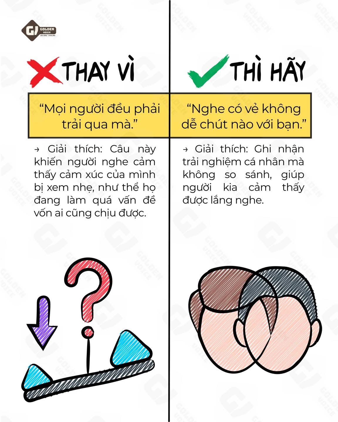 → Giải thích: Ghi nhận trải nghiệm cá nhân mà không so sánh, giúp người kia cảm thấy được lắng nghe.