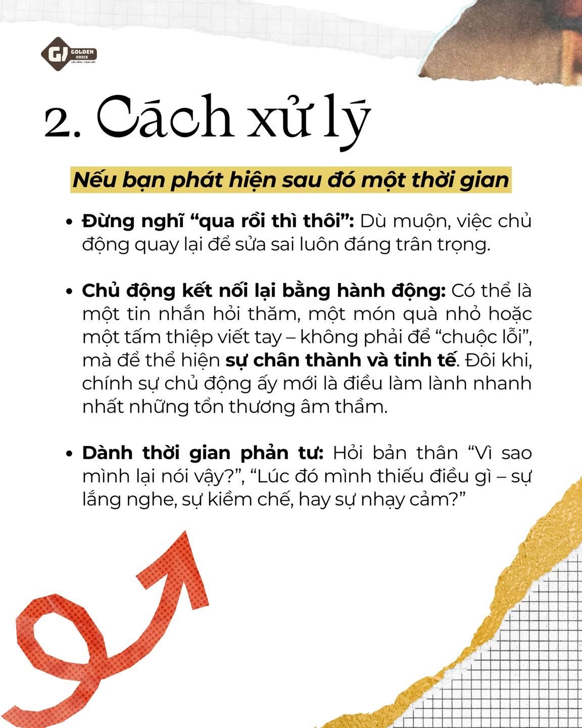 Lời nói có thể làm tổn thương – nhưng cũng có thể hàn gắn. Điều phân biệt một người vô tâm với một người trưởng thành không nằm ở việc không bao giờ lỡ lời, mà là biết dừng lại, nhận lỗi và học cách sửa chữa. Hãy biến nó thành một bước tiến trong hành trình trưởng thành.