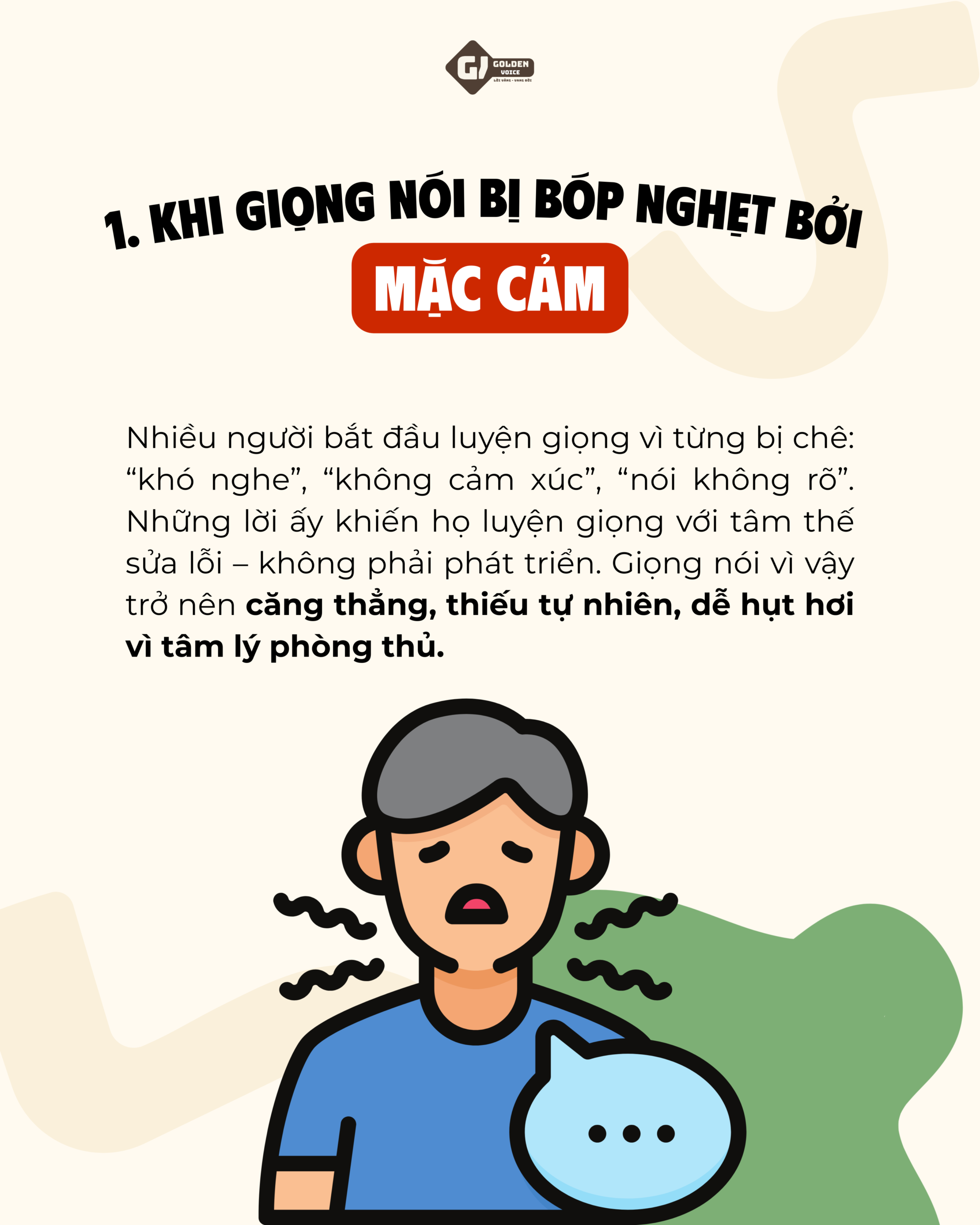 Theo nhà trị liệu ngôn ngữ Susan E. Langmore (Journal of Speech and Hearing Disorders, 1995), trạng thái lo lắng thường xuyên về giọng nói có thể khiến cổ họng co thắt nhẹ, giảm độ vang và tạo ra âm thanh không ổn định. Càng mặc cảm, giọng càng mất lực. Càng cố sửa, lại càng thiếu tự nhiên.