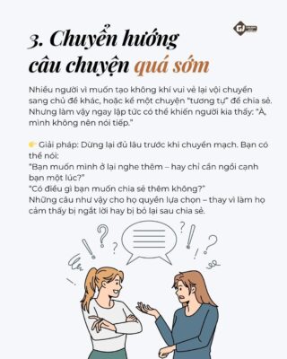 Nhiều người vì muốn tạo không khí vui vẻ lại vội chuyển sang chủ đề khác, hoặc kể một chuyện “tương tự” để chia sẻ. Nhưng làm vậy ngay lập tức có thể khiến người kia thấy: “À, mình không nên nói tiếp.”