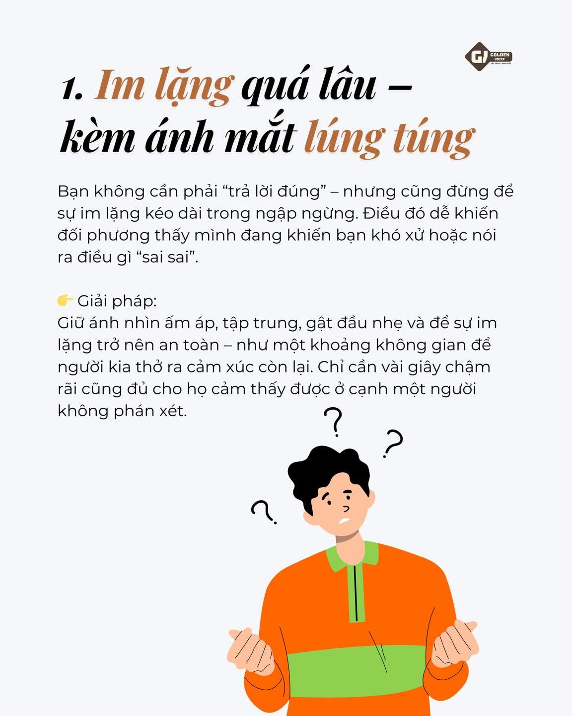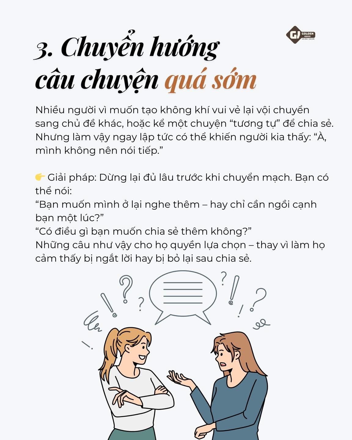 Nếu bạn muốn rèn luyện kỹ năng này sâu sắc hơn, hãy theo dõi series “Kỹ năng Lắng nghe” hoặc tìm hiểu khoá học NGHỆ THUẬT GIAO TIẾP tại Golden Voice – nơi mỗi lời nói đều bắt đầu từ sự lắng nghe.