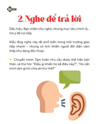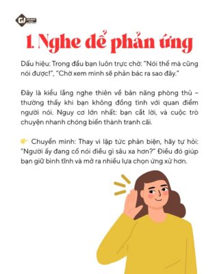 Đây là kiểu lắng nghe thiên về bản năng phòng thủ – thường thấy khi bạn không đồng tình với quan điểm người nói. Nguy cơ lớn nhất: bạn cắt lời, và cuộc trò chuyện nhanh chóng biến thành tranh cãi.