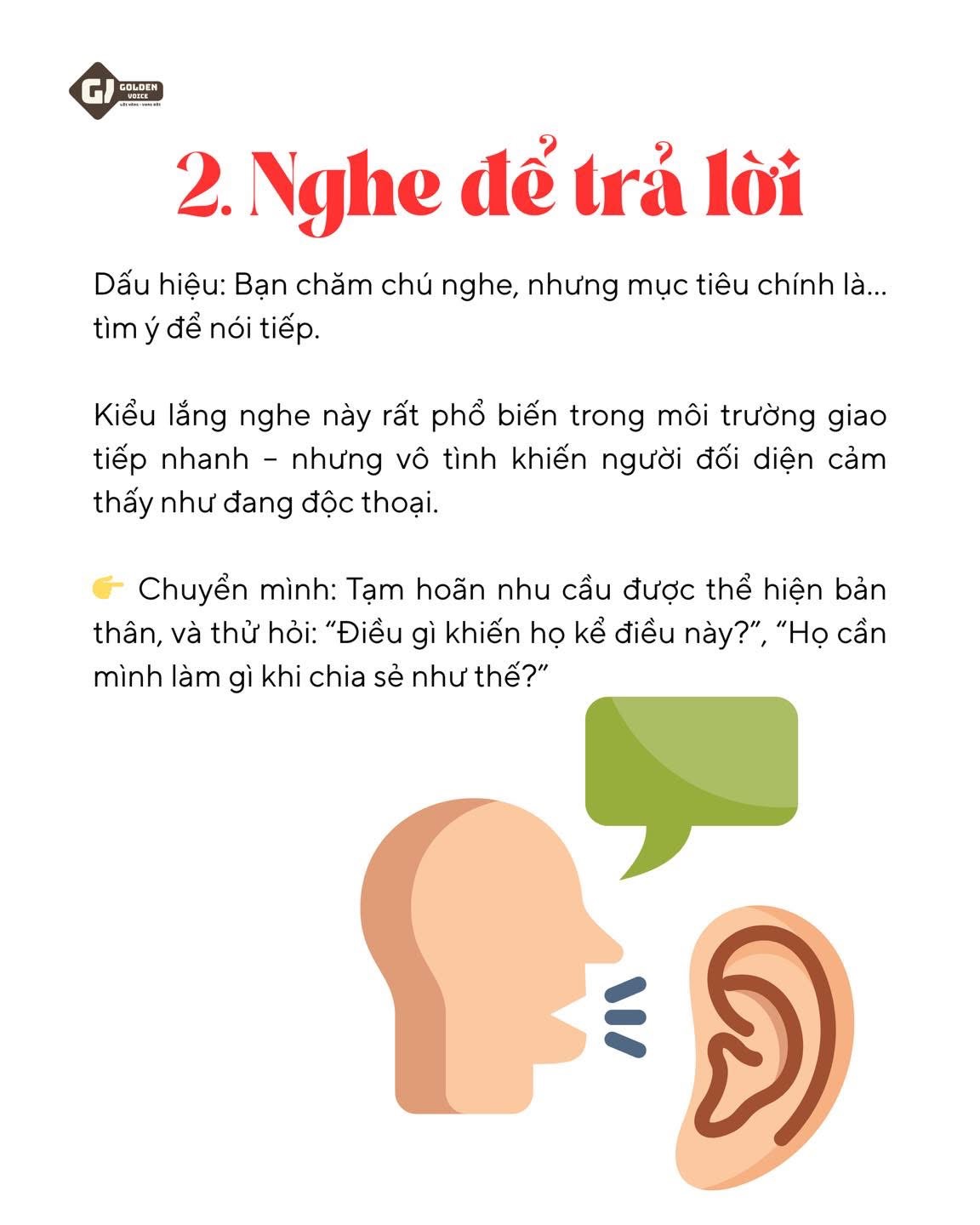 Đây là kiểu lắng nghe thiên về bản năng phòng thủ – thường thấy khi bạn không đồng tình với quan điểm người nói. Nguy cơ lớn nhất: bạn cắt lời, và cuộc trò chuyện nhanh chóng biến thành tranh cãi.