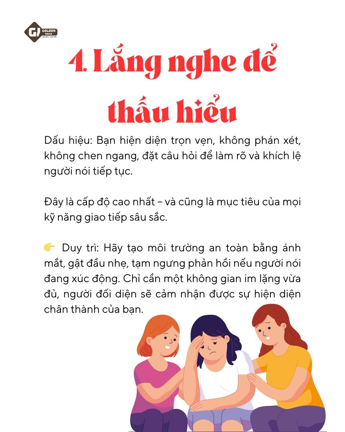 👉 Duy trì: Hãy tạo môi trường an toàn bằng ánh mắt, gật đầu nhẹ, tạm ngưng phản hồi nếu người nói đang xúc động. Chỉ cần một không gian im lặng vừa đủ, người đối diện sẽ cảm nhận được sự hiện diện chân thành của bạn.