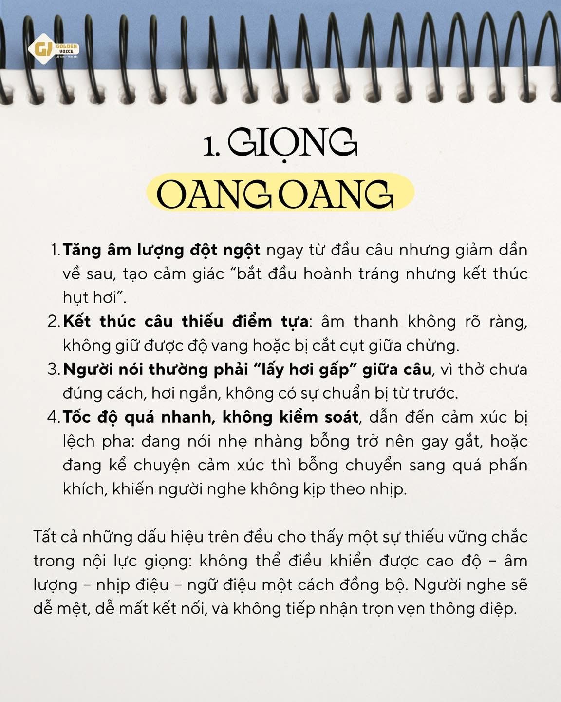 → Hãy thu âm lại và nghe kỹ: nếu bạn thấy giọng mình to nhưng thiếu điểm tựa, nói nhanh nhưng hụt hơi, hoặc người đối diện thường lùi lại khi bạn nói – có thể bạn đang nói bằng giọng oang oang.