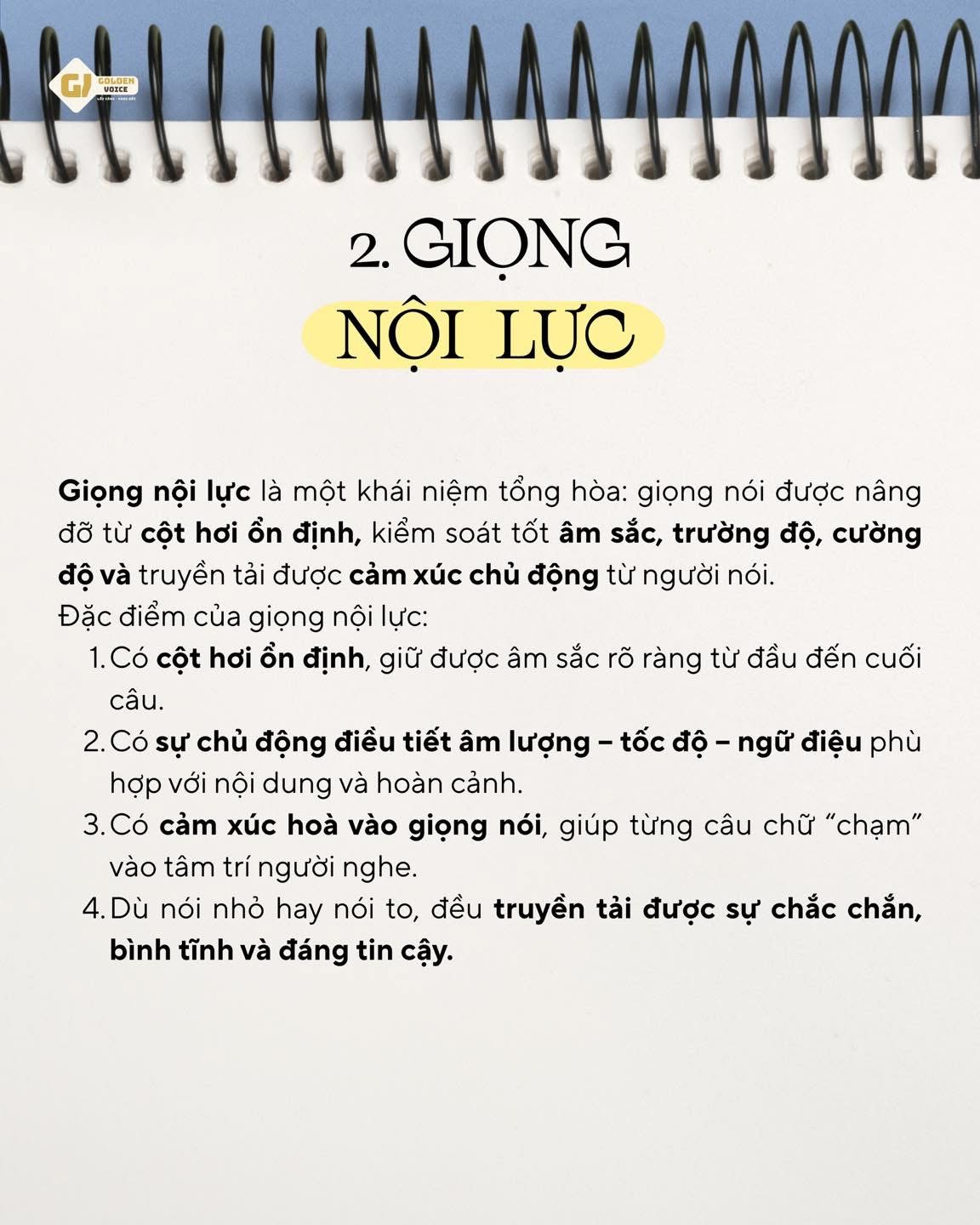 Giọng nội lực là một khái niệm tổng hòa: giọng nói được nâng đỡ từ cột hơi ổn định, kiểm soát tốt âm sắc, trường độ, cường độ và truyền tải được cảm xúc chủ động từ người nói.