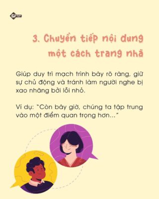 Tóm tắt lại một câu: “Tôi xin kết lại ý vừa nêu là…” rồi chuyển sang phần tiếp theo.