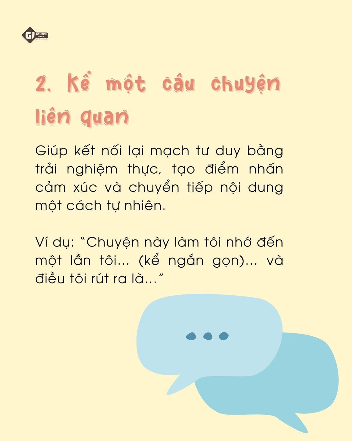 Tóm tắt lại một câu: “Tôi xin kết lại ý vừa nêu là…” rồi chuyển sang phần tiếp theo.