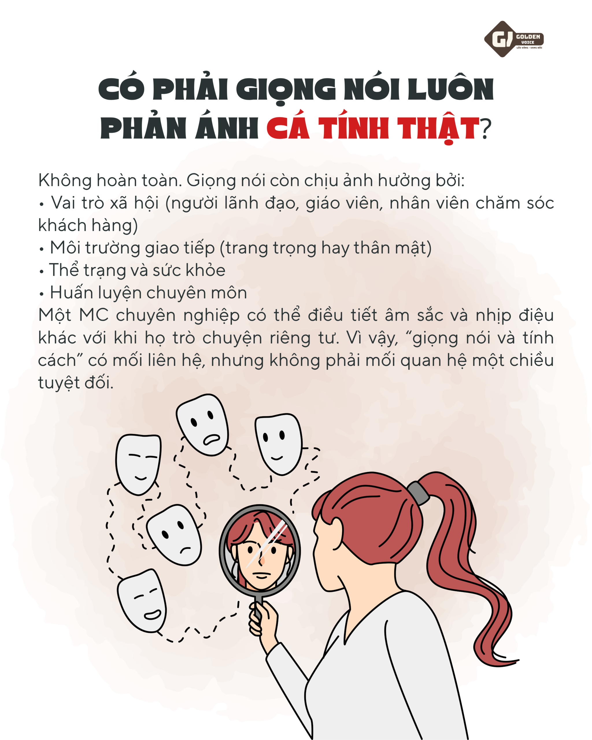 Một MC chuyên nghiệp có thể điều tiết âm sắc và nhịp điệu khác với khi họ trò chuyện riêng tư. Vì vậy, “giọng nói và tính cách” có mối liên hệ, nhưng không phải mối quan hệ một chiều tuyệt đối.
